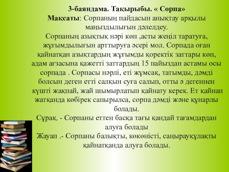 Мақсаты: Сорпаның пайдасын анықтау арқылы маңыздылығын дәлелдеу.