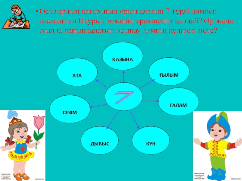 Слайд 4Осылардың қатарынан орын алатын 7 түрлі дәмнен жасалатын Наурыз көженің ерекшелігі