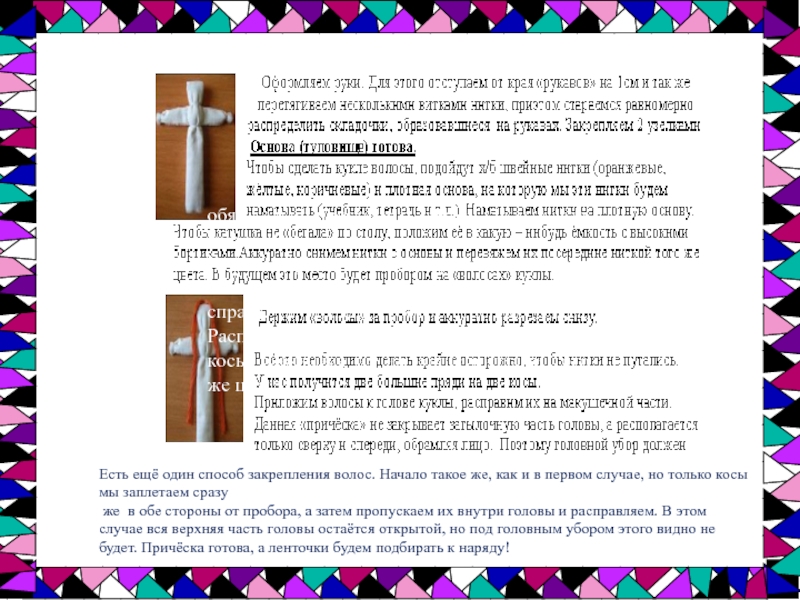 же в обе стороны от пробора, а затем пропускаем их внутри головы и расправляем. В этом случае вся верхняя часть головы остаётся открытой, но под головным убором этого видно не будет. Причёска готова, а ленточки будем подбирать к наряду!