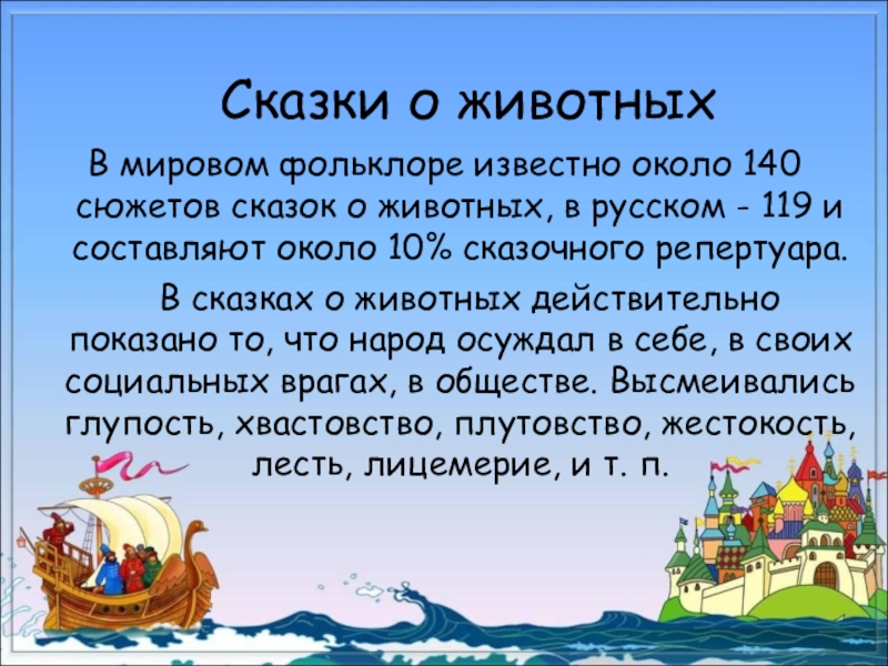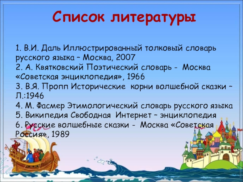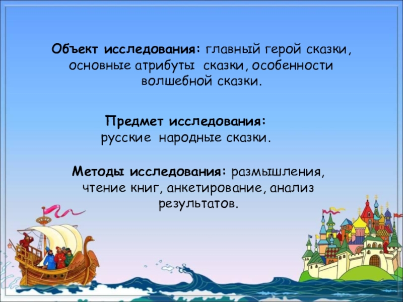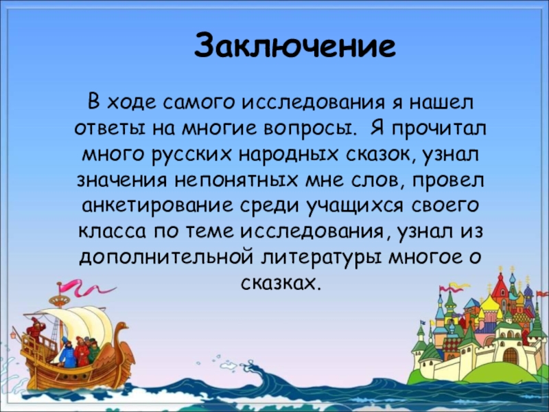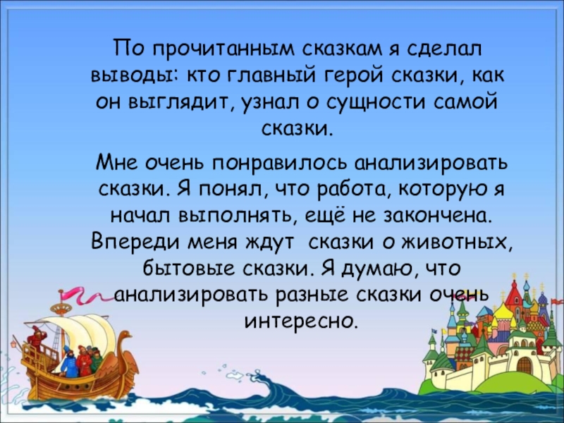 Мне очень понравилось анализировать сказки. Я понял, что работа, которую я начал выполнять, ещё не закончена. Впереди меня ждут сказки о животных, бытовые сказки. Я думаю, что анализировать разные сказки очень интересно.