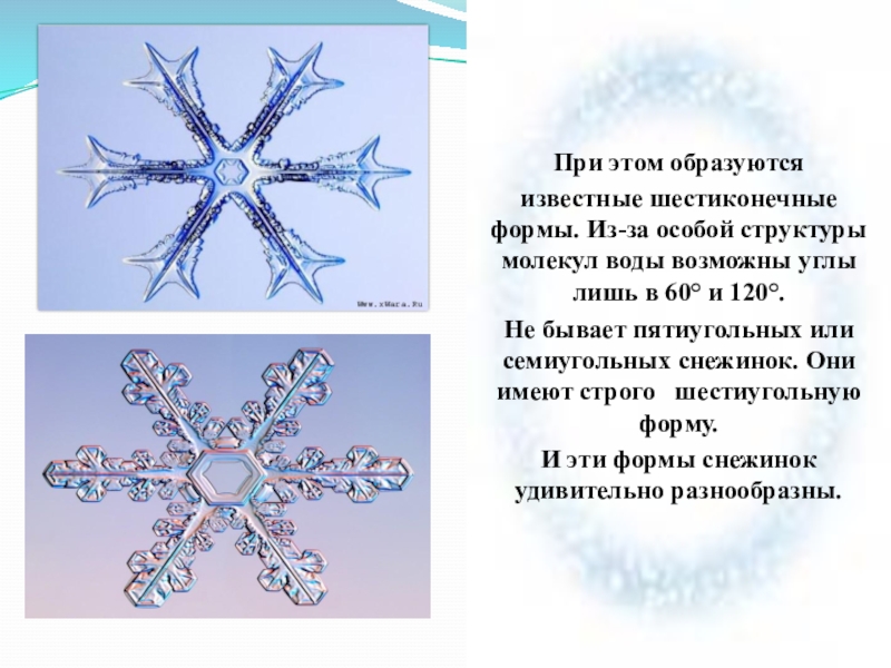 Не бывает пятиугольных или семиугольных снежинок. Они имеют строго шестиугольную форму.
