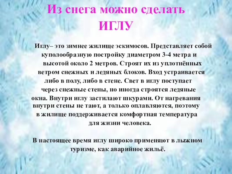 окна. Внутри иглу застилают шкурами. От нагревания внутри стены не тают, а только оплавляются, поэтому