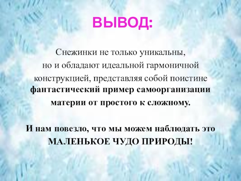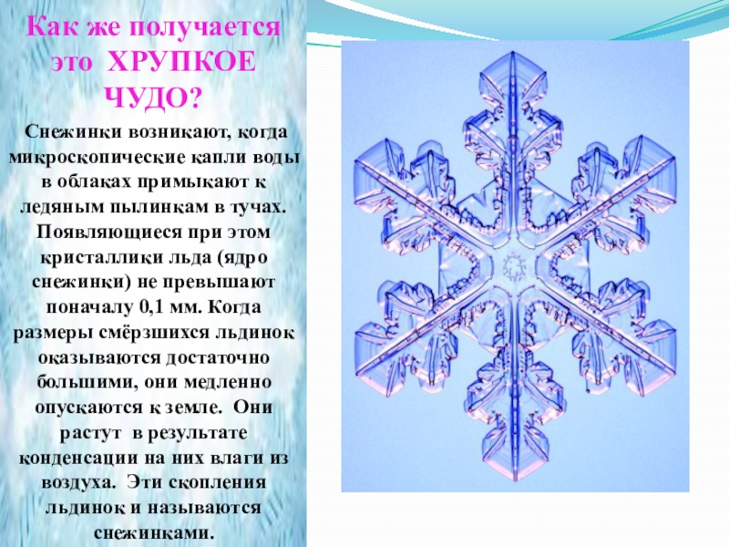 воды в облаках примыкают к ледяным пылинкам в тучах. Появляющиеся при этом кристаллики льда (ядро снежинки) не превышают поначалу 0,1 мм. Когда размеры смёрзшихся льдинок оказываются достаточно большими, они медленно опускаются к земле. Они растут в результате конденсации на них влаги из воздуха. Эти скопления льдинок и называются снежинками.