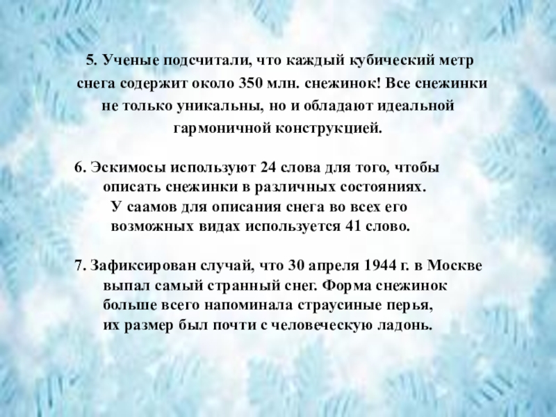 том, что обычные снежинки в среднем имеют диаметр 5 мм.