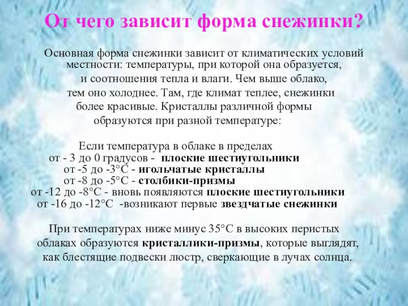 Основная форма снежинки зависит от климатических условий местности: температуры, при которой она образуется,