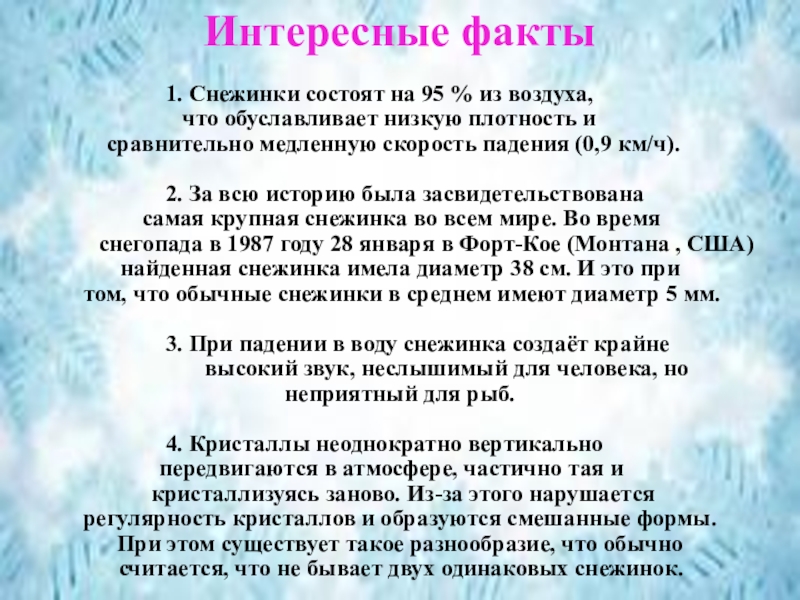 снегопада в 1987 году 28 января в Форт-Кое (Монтана , США) найденная снежинка имела диаметр 38 см. И это при