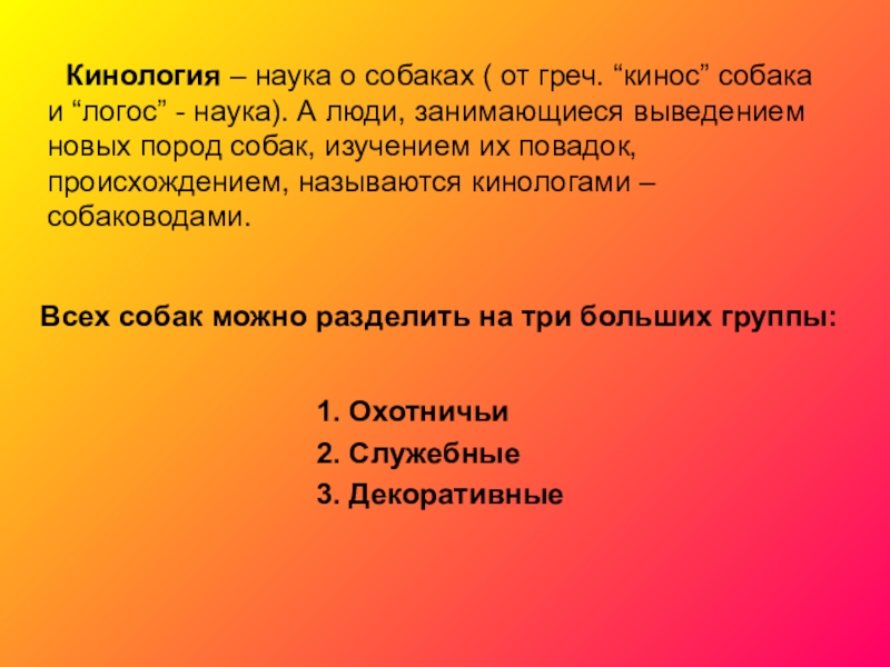 Кинология – наука о собаках ( от греч. “кинос” собака и “логос” - наука). А люди, занимающиеся выведением новых пород собак, изучением их повадок, происхождением, называются кинологами – собаководами.