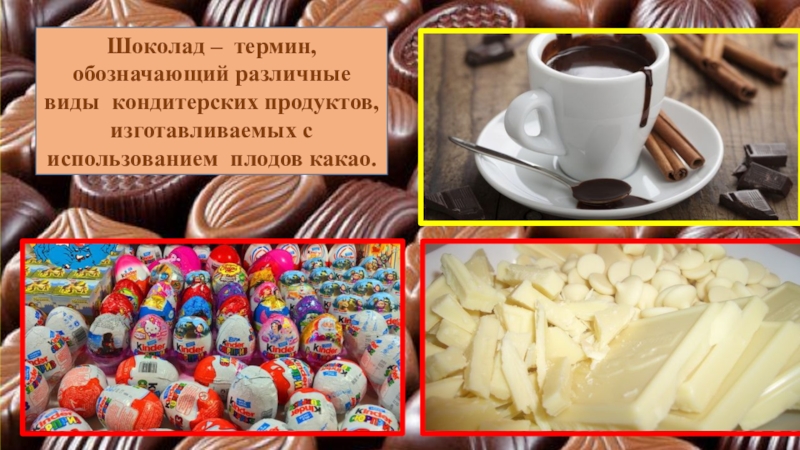 Слайд 4Шоколад – термин, обозначающий различные виды кондитерских продуктов, изготавливаемых с