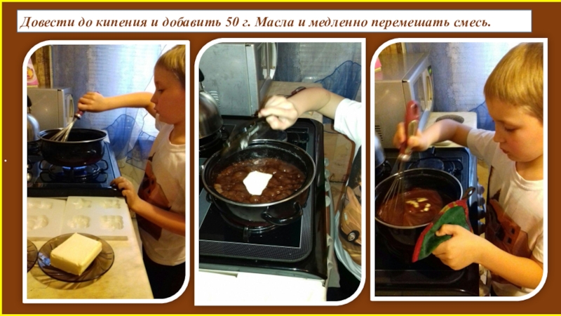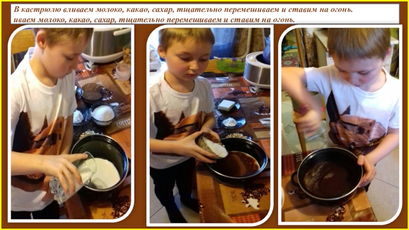 Слайд 15В кастрюлю вливаем молоко, какао, сахар, тщательно перемешиваем и ставим на