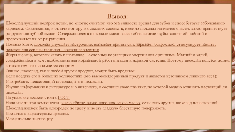 для зубов и способствует заболеванию кариесом. Оказывается, в отличие от других сладких лакомств, именно шоколад наименее опасен: какао препятствует разрушению зубной эмали. Содержащиеся в шоколаде масло какао обволакивает зубы защитной плёнкой и предохраняет их от разрушения.