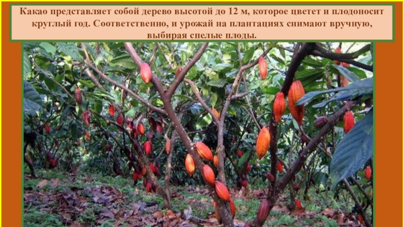 Слайд 6Какао представляет собой дерево высотой до 12 м, которое цветет и