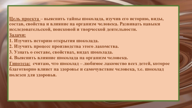 Цель проекта – выяснить тайны шоколада, изучив его историю, виды, состав,