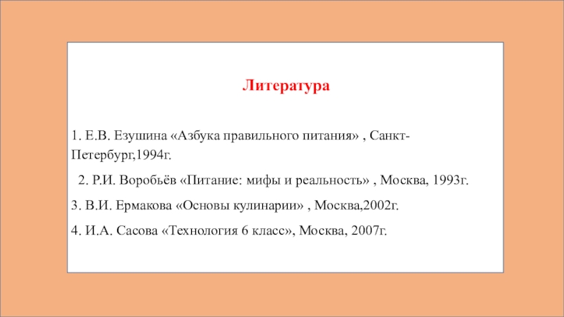 1. Е.В. Езушина «Азбука правильного питания» , Санкт-Петербург,1994г.