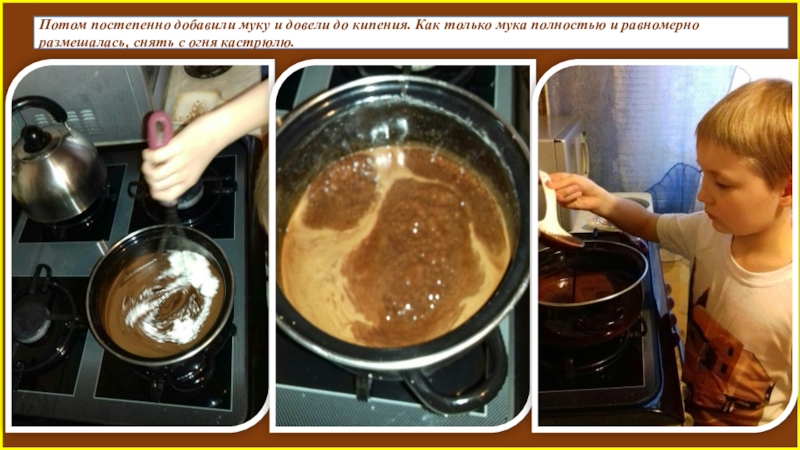 Слайд 17Потом постепенно добавили муку и довели до кипения. Как только мука