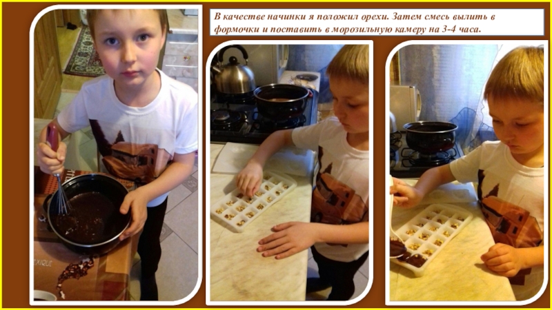 Слайд 18В качестве начинки я положил орехи. Затем смесь вылить в формочки