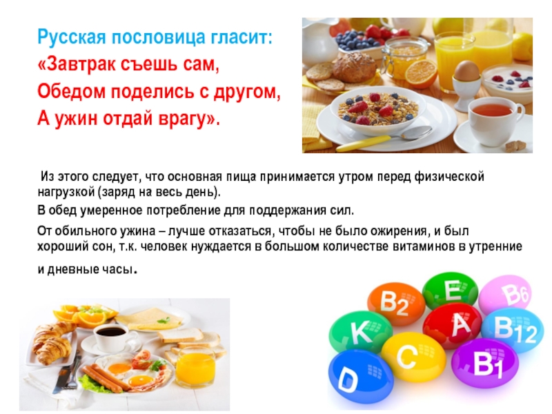Из этого следует, что основная пища принимается утром перед физической нагрузкой (заряд на весь день).