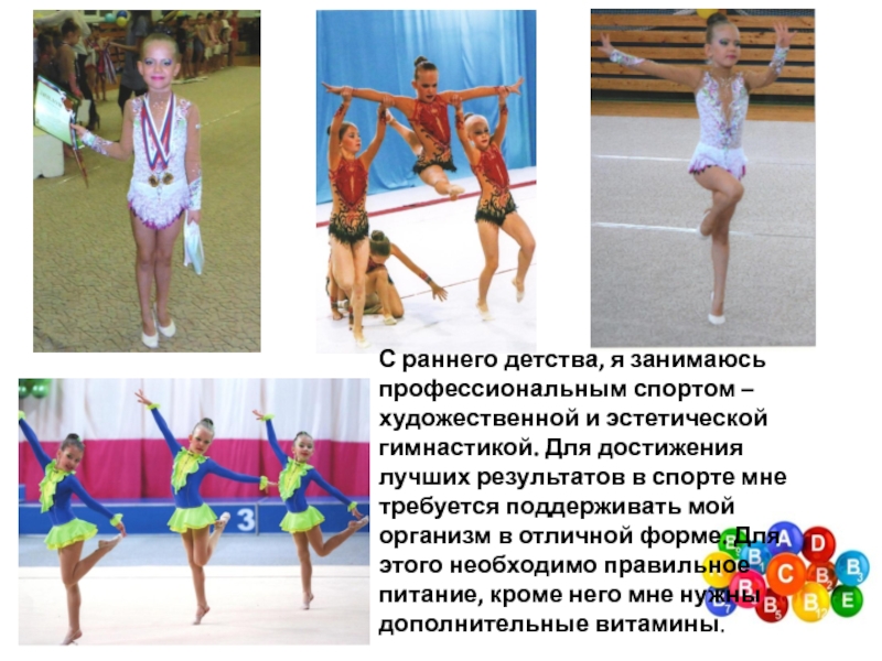 гимнастикой. Для достижения лучших результатов в спорте мне требуется поддерживать мой организм в отличной форме. Для этого необходимо правильное питание, кроме него мне нужны дополнительные витамины.