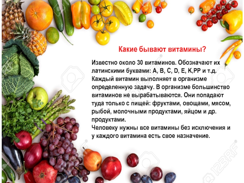 Каждый витамин выполняет в организме определенную задачу. В организме большинство витаминов не вырабатываются. Они попадают туда только с пищей: фруктами, овощами, мясом, рыбой, молочными продуктами, яйцом и др. продуктами.