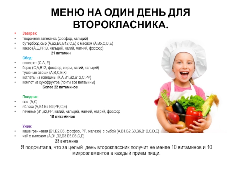 Я подсчитала, что за целый день второклассник получит не менее 10 витаминов и 10 микроэлементов в каждый прием пищи.