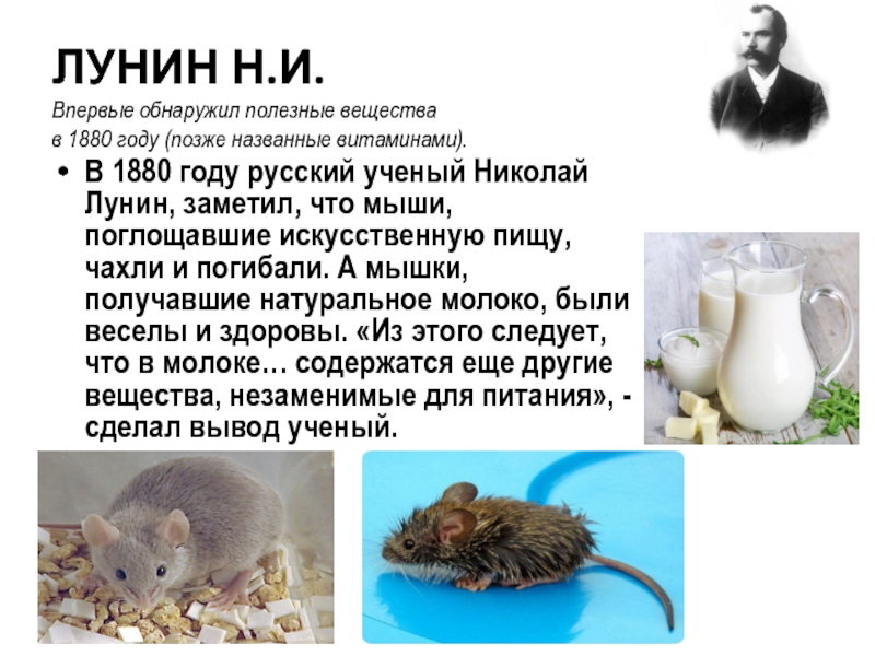 В 1880 году русский ученый Николай Лунин, заметил, что мыши, поглощавшие искусственную пищу, чахли и погибали. А мышки, получавшие натуральное молоко, были веселы и здоровы. «Из этого следует, что в молоке… содержатся еще другие вещества, незаменимые для питания», - сделал вывод ученый.