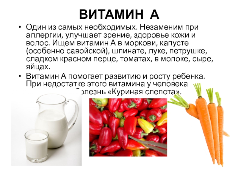 Витамин А помогает развитию и росту ребенка. При недостатке этого витамина у человека развивается болезнь «Куриная слепота».