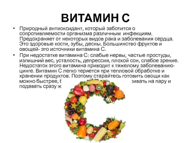 от некоторых видов рака и заболевания сердца. Это здоровые кости, зубы, десны. Большинство фруктов и овощей- это источники витамина С.