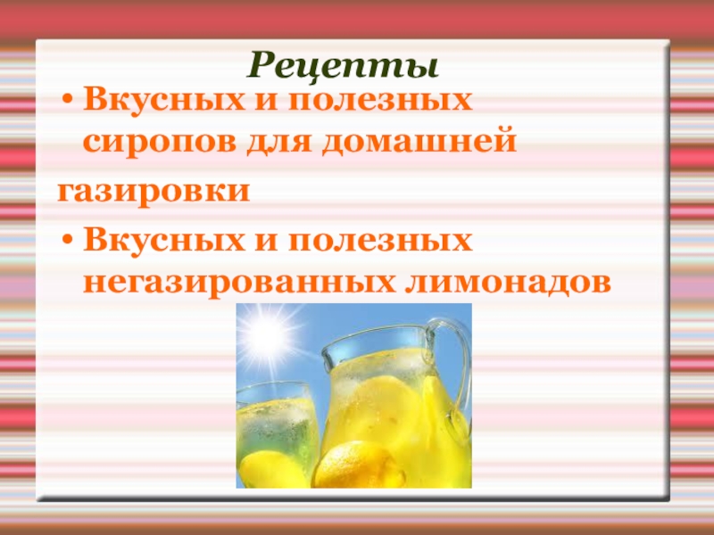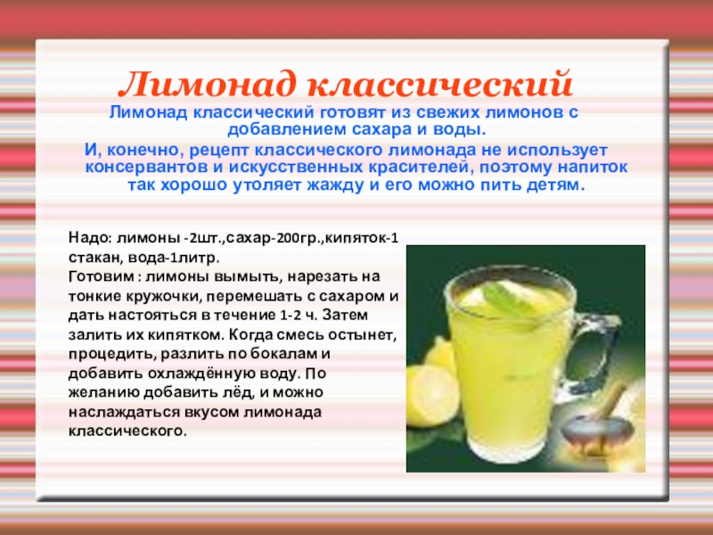 Слайд 30Лимонад классический готовят из свежих лимонов с добавлением сахара и воды.
