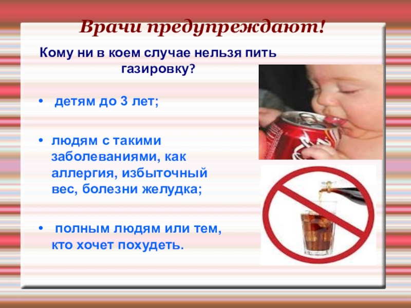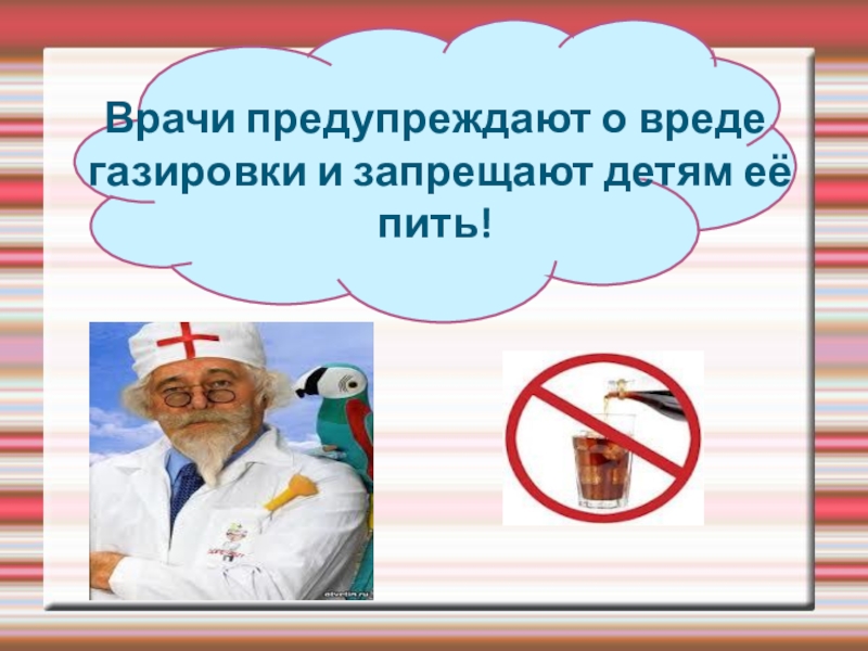 Слайд 3Врачи предупреждают о вреде газировки и запрещают детям её пить!