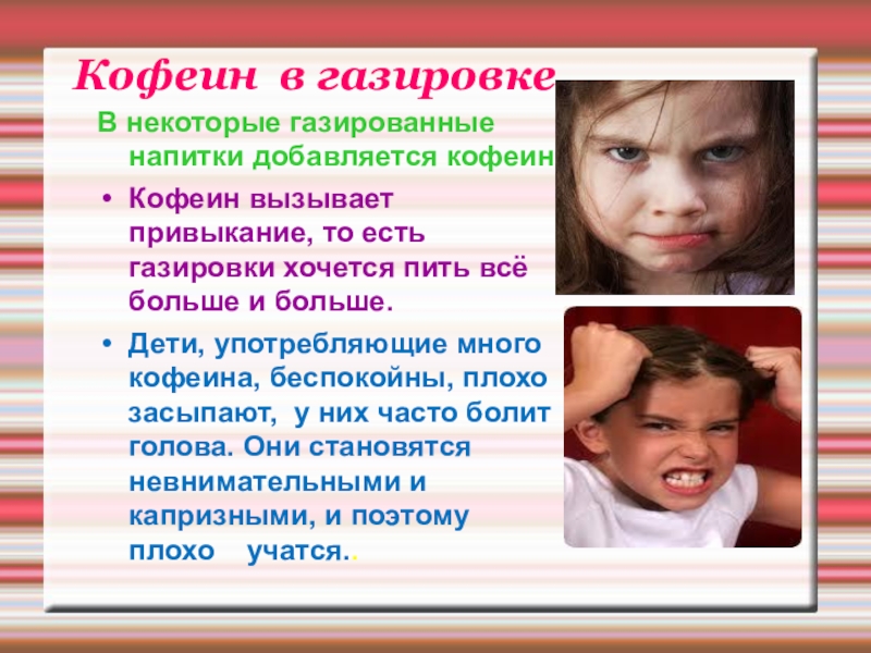 Дети, употребляющие много кофеина, беспокойны, плохо засыпают, у них часто болит голова. Они становятся невнимательными и капризными, и поэтому плохо учатся..