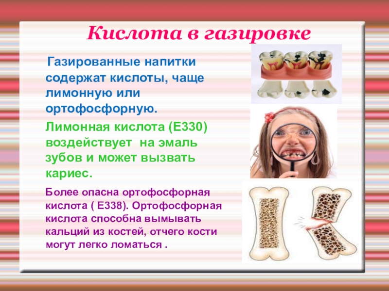 Более опасна ортофосфорная кислота ( Е338). Ортофосфорная кислота способна вымывать кальций из костей, отчего кости могут легко ломаться .