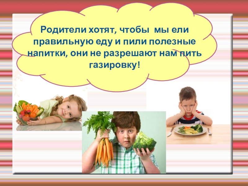 Слайд 2Родители хотят, чтобы мы ели правильную еду и пили полезные напитки,
