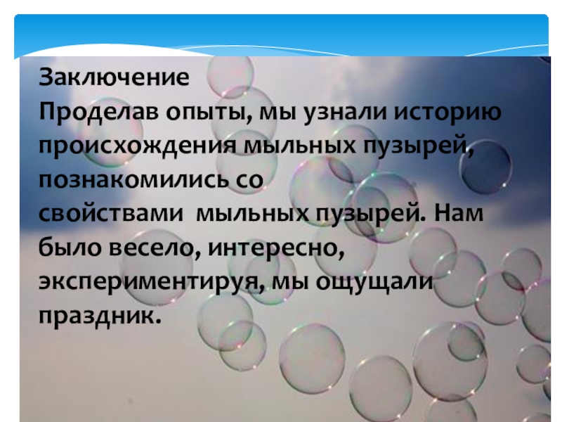 Слайд 13Заключение Проделав опыты, мы узнали историю происхождения мыльных пузырей, познакомились со свойствами