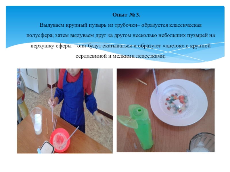 Слайд 11Опыт № 3. Выдуваем крупный пузырь из трубочки– образуется классическая полусфера;