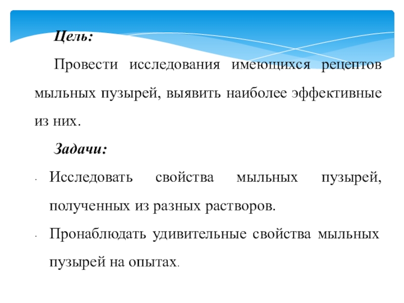 Цель:Провести исследования имеющихся рецептов мыльных пузырей, выявить наиболее эффективные из них.Задачи:Исследовать свойства мыльных пузырей, полученных из разных