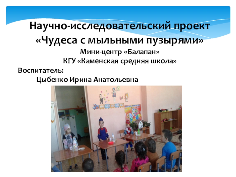 Научно-исследовательский проект «Чудеса с мыльными пузырями»Мини-центр «Балапан»КГУ «Каменская средняя школа» Воспитатель: Цыбенко Ирина Анатольевна