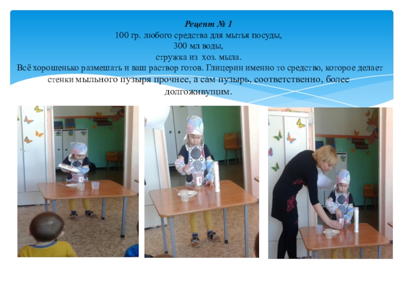 Слайд 5Рецепт № 1 100 гр. любого средства для мытья посуды, 300 мл воды, стружка