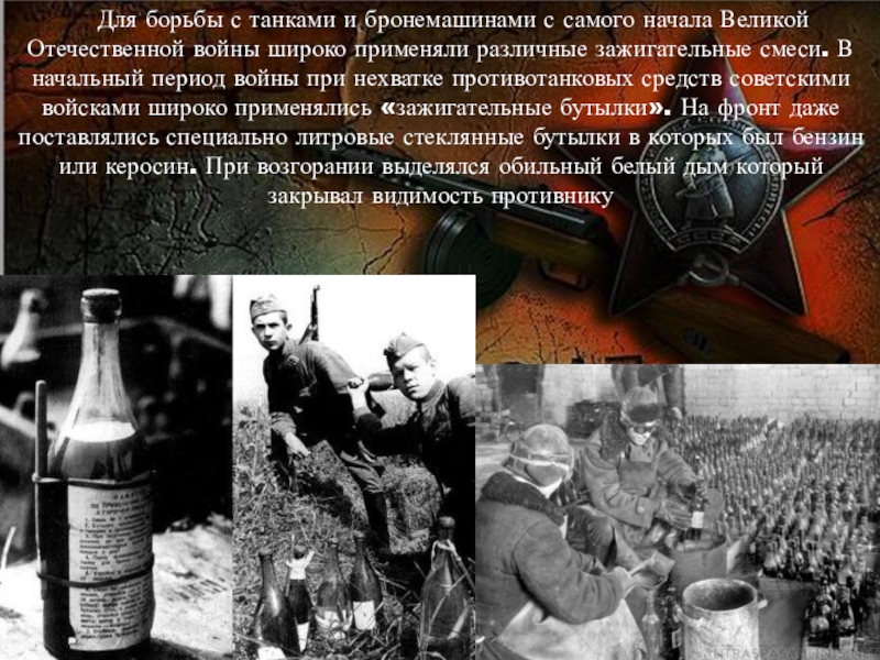 Великой Отечественной войны широко применяли различные зажигательные смеси. В начальный период войны при нехватке противотанковых средств советскими войсками широко применялись «зажигательные бутылки». На фронт даже поставлялись специально литровые стеклянные бутылки в которых был бензин или керосин. При возгорании выделялся обильный белый дым который закрывал видимость противнику