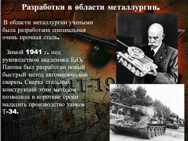 Зимой 1941 г. под руководством академика Е.О.Патона был разработан новый быстрый метод автоматической сварки. Сварка стальных конструкций этим методом позволила в короткие сроки наладить производство танков Т-34.