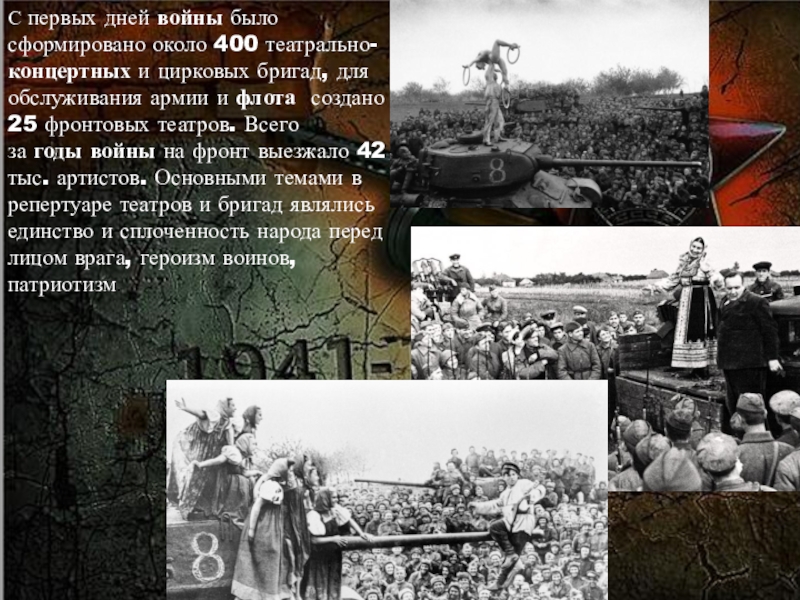 Слайд 25С первых дней войны было сформировано около 400 театрально-концертных и цирковых бригад, для обслуживания