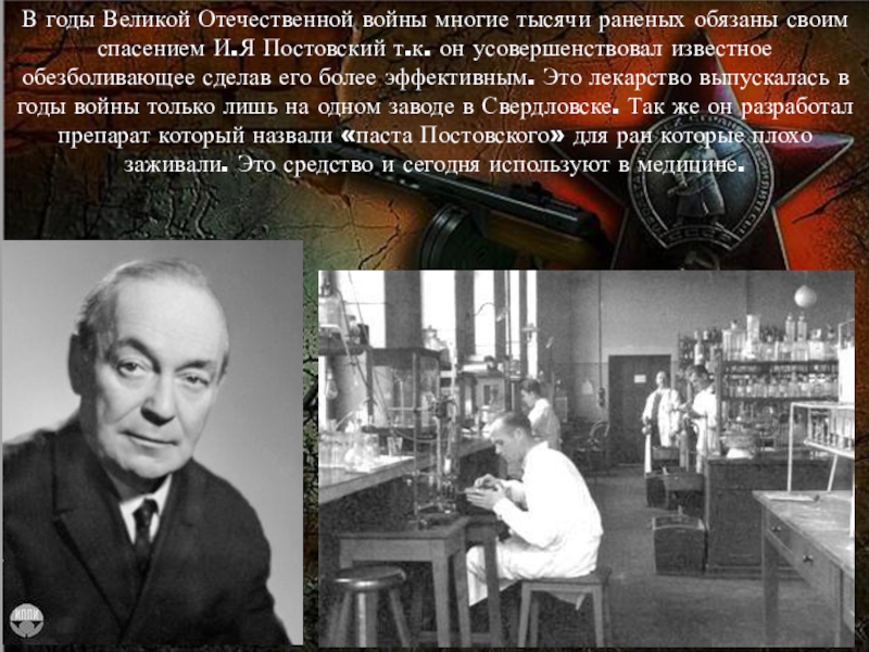 И.Я Постовский т.к. он усовершенствовал известное обезболивающее сделав его более эффективным. Это лекарство выпускалась в годы войны только лишь на одном заводе в Свердловске. Так же он разработал препарат который назвали «паста Постовского» для ран которые плохо заживали. Это средство и сегодня используют в медицине.