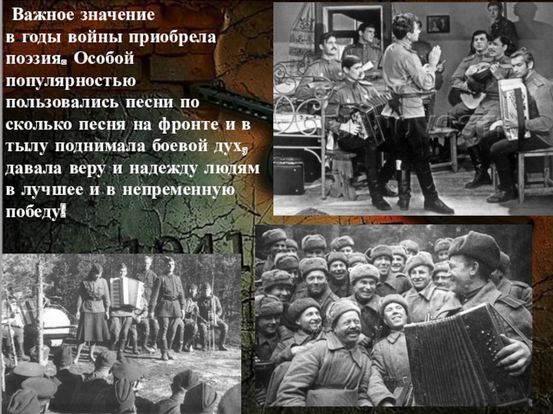 Слайд 22 Важное значение в годы войны приобрела поэзия. Особой популярностью пользовались песни по сколько песня