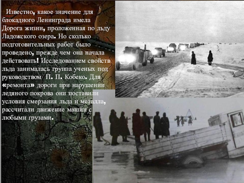 проложенная по льду Ладожского озера. Но сколько подготовительных работ было проведено, прежде чем она начала действовать! Исследованием свойств льда занималась группа ученых под руководством П. П. Кобеко. Для «ремонта» дороги при нарушении ледяного покрова они поставили условия смерзания льда и металла, рассчитали движение машин с любыми грузами.