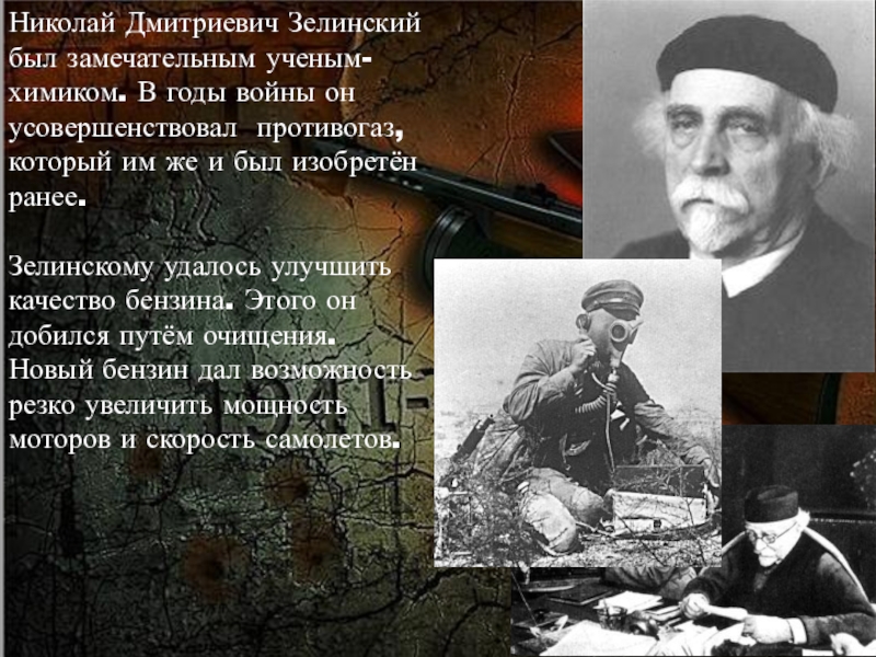 Слайд 19Николай Дмитриевич Зелинский был замечательным ученым-химиком. В годы войны он усовершенствовал
