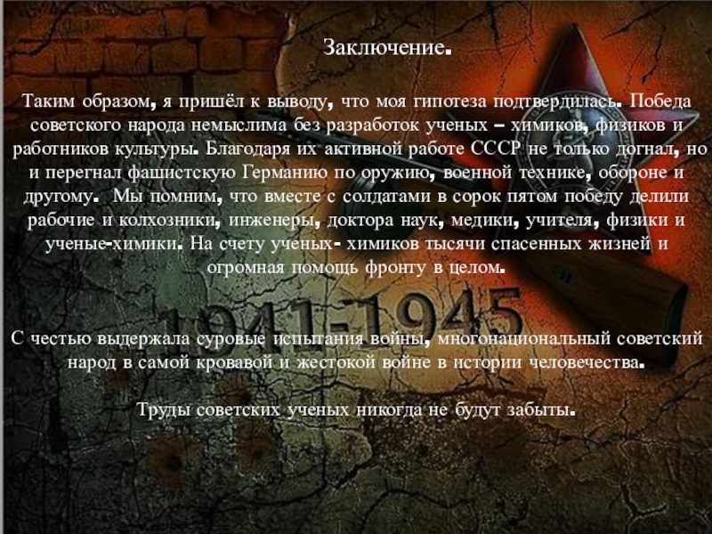 моя гипотеза подтвердилась. Победа советского народа немыслима без разработок ученых – химиков, физиков и работников культуры. Благодаря их активной работе СССР не только догнал, но и перегнал фашистскую Германию по оружию, военной технике, обороне и другому. Мы помним, что вместе с солдатами в сорок пятом победу делили рабочие и колхозники, инженеры, доктора наук, медики, учителя, физики и ученые-химики. На счету ученых- химиков тысячи спасенных жизней и огромная помощь фронту в целом.