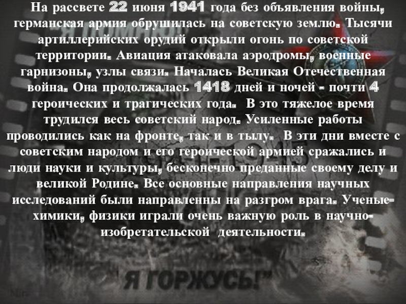 армия обрушилась на советскую землю. Тысячи артиллерийских орудий открыли огонь по советской территории. Авиация атаковала аэродромы, военные гарнизоны, узлы связи. Началась Великая Отечественная война. Она продолжалась 1418 дней и ночей - почти 4 героических и трагических года. В это тяжелое время трудился весь советский народ. Усиленные работы проводились как на фронте, так и в тылу. В эти дни вместе с советским народом и его героической армией сражались и люди науки и культуры, бесконечно преданные своему делу и великой Родине. Все основные направления научных исследований были направленны на разгром врага. Ученые-химики, физики играли очень важную роль в научно- изобретательской деятельности.