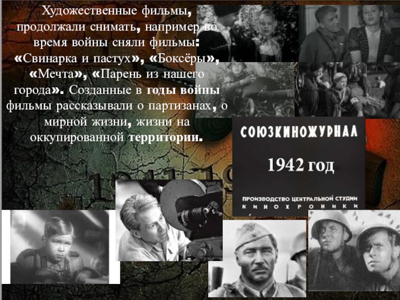 Слайд 24Художественные фильмы, продолжали снимать, например во время войны сняли фильмы: «Свинарка и