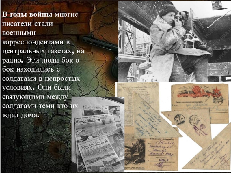 Слайд 23В годы войны многие писатели стали военными корреспондентами в центральных газетах, на радио. Эти