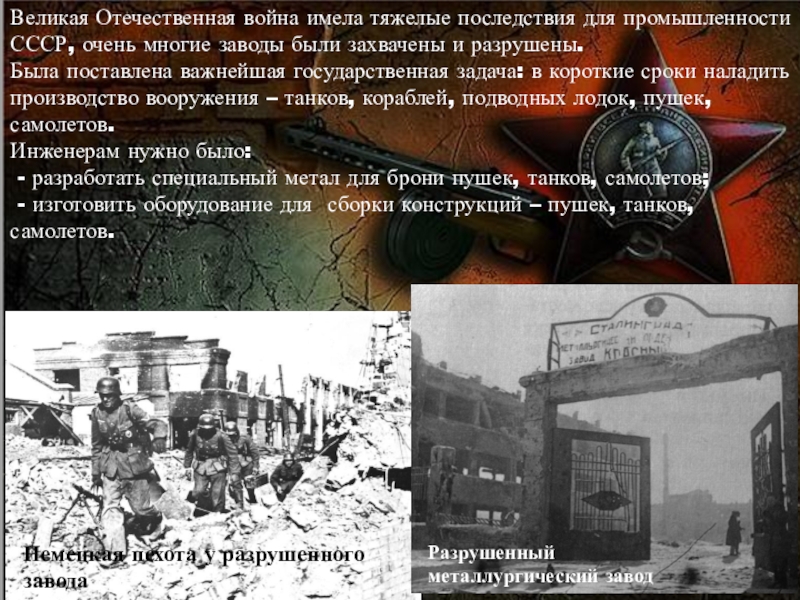 Слайд 12Великая Отечественная война имела тяжелые последствия для промышленности СССР, очень многие