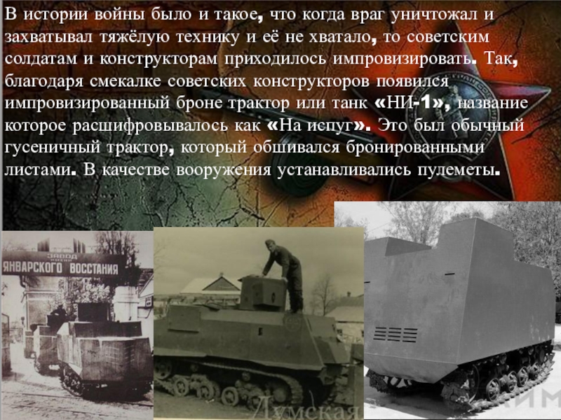 захватывал тяжёлую технику и её не хватало, то советским солдатам и конструкторам приходилось импровизировать. Так, благодаря смекалке советских конструкторов появился импровизированный броне трактор или танк «НИ-1», название которое расшифровывалось как «На испуг». Это был обычный гусеничный трактор, который обшивался бронированными листами. В качестве вооружения устанавливались пулеметы.