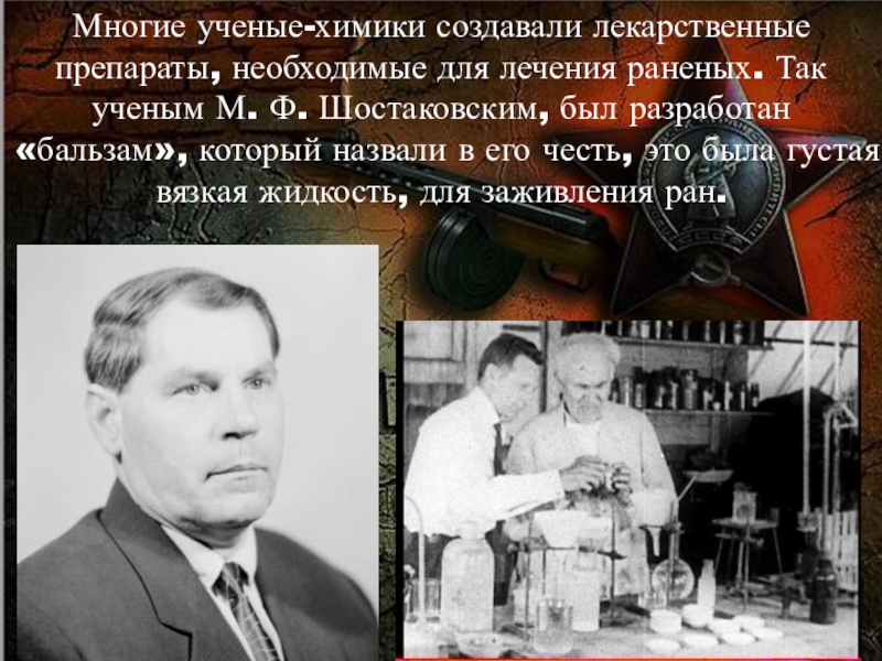 Слайд 13Многие ученые-химики создавали лекарственные препараты, необходимые для лечения раненых. Так ученым